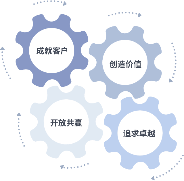 成就客户是一切决策的出发点,,,创造价值是衡量所有工作的标准,,,,追求卓越是我们做事做人的态度,,开放共赢是我们的格局也是最终的结果。。。。价值观的齿轮环环相扣,,推动着组织里的每个人不断向前。。