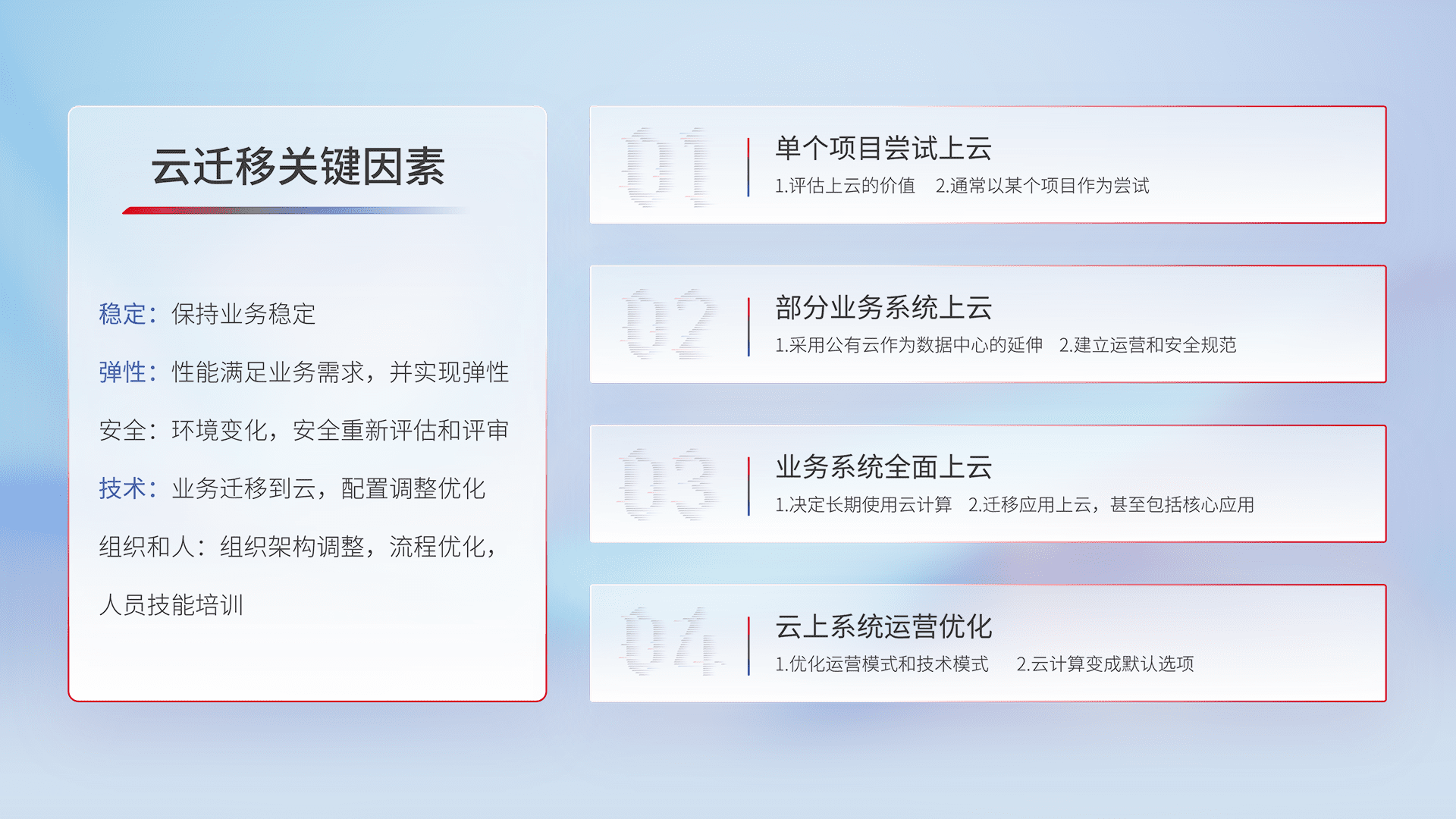 结合实际业务,,,,从规划设计、、、、云平台选型、、、、云原生改造、、、数据迁移、、、、集成交付,,,,迁移全过程为客户识别最佳上云路径,,,,做好风险识别管理,,设计网络架构、、、、身份权限、、、、安全审计合规、、、、操作审计、、、、日志审计、、、、监控告警策略、、、多站点容灾设计等,,对云上基础设施进行整体规划,,,提升IT治理水平,,,,以满足弹性、、、、高可用、、、、高性能的需求。。。