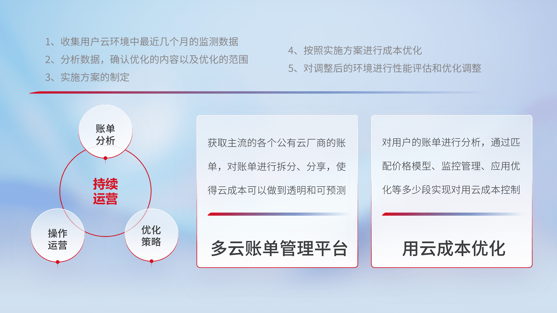 通过多云纳管,,,,以统一的资源数据模型把客户的云资源进行抽象和封装,,,进而实现对多云资源的统一操作,,,保障云资源管理的可靠性、、稳定性与可用性。。量身定制化运维内容,,,,配置、、、开发运维、、、、补丁管理、、、备份、、监控、、、认证和访问管理、、审计和日常巡检等,,,,保障在用云过程中的可靠度,,,,稳定度以及高可用率。。。。